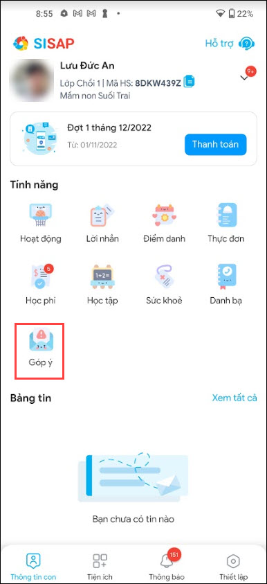1. Vào ứng dụng SISAP Phụ huynh, chọn Góp ý.