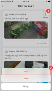 Phụ huynh có thể thực hiện chỉnh sửa/xóa góp ý nếu nhà trường chưa xác nhận bằng cách nhấn vào biểu tượng ba chấm, chọn Sửa/Xóa.