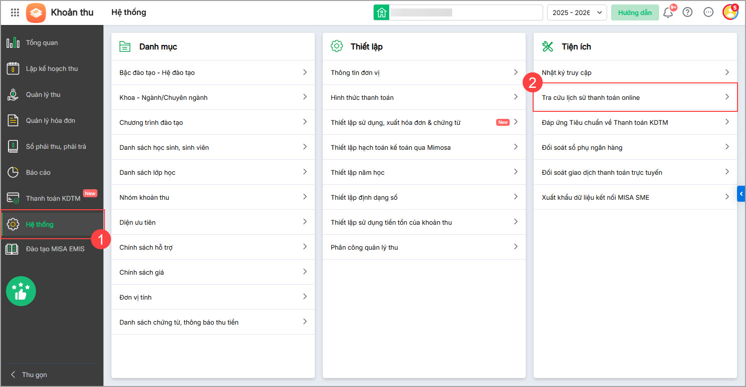 - Vào Hệ thống\Tra cứu lịch sử thanh toán online.