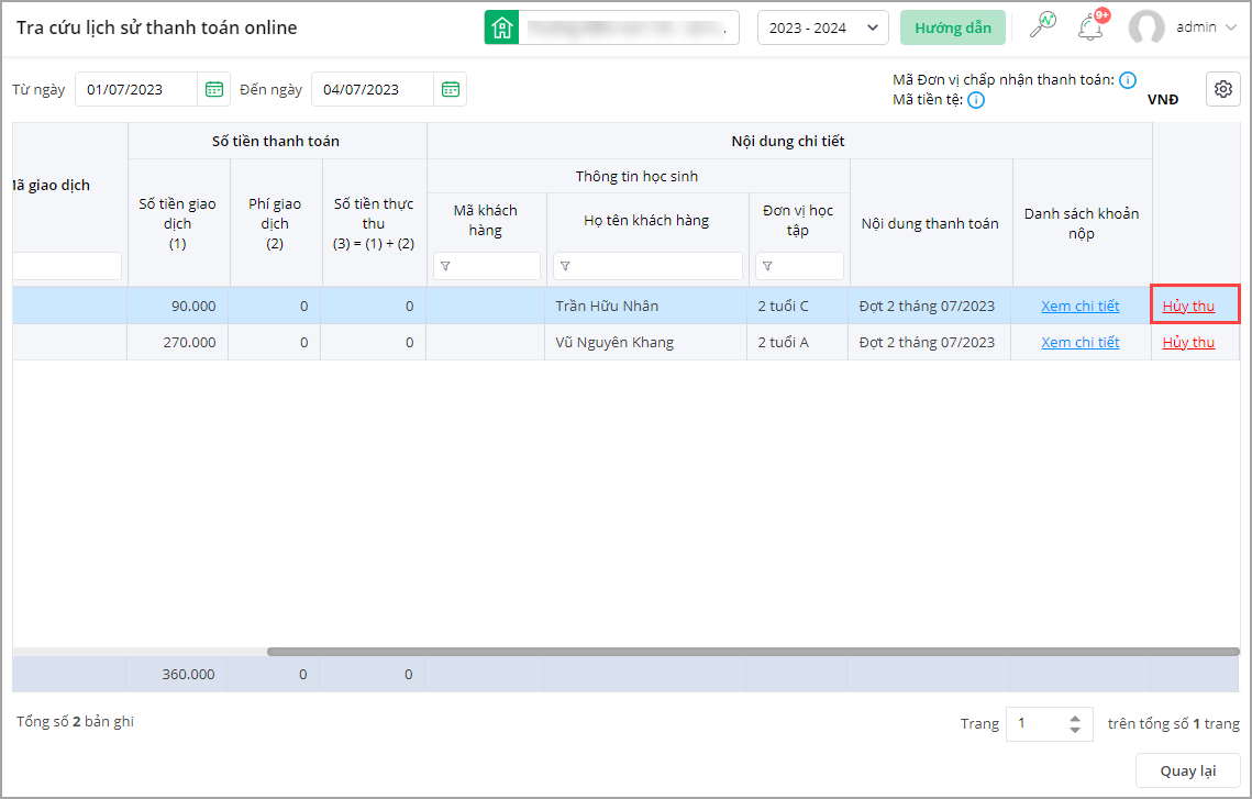 - Trường hợp Kế toán lập đợt thu thừa/thiếu khoản thu, sai số lượng đăng ký,… và muốn Hủy thu cho giao dịch: