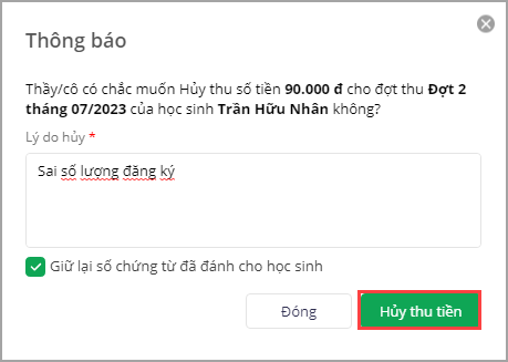 - Nhập Lý do hủy thu và tùy chọn Giữ lại số chứng từ đã đánh cho học sinh (để sau này thu tiền lại của học sinh vẫn giữ nguyên số chứng từ đã đánh, tránh số chứng từ bị trống)