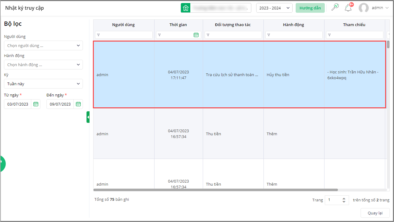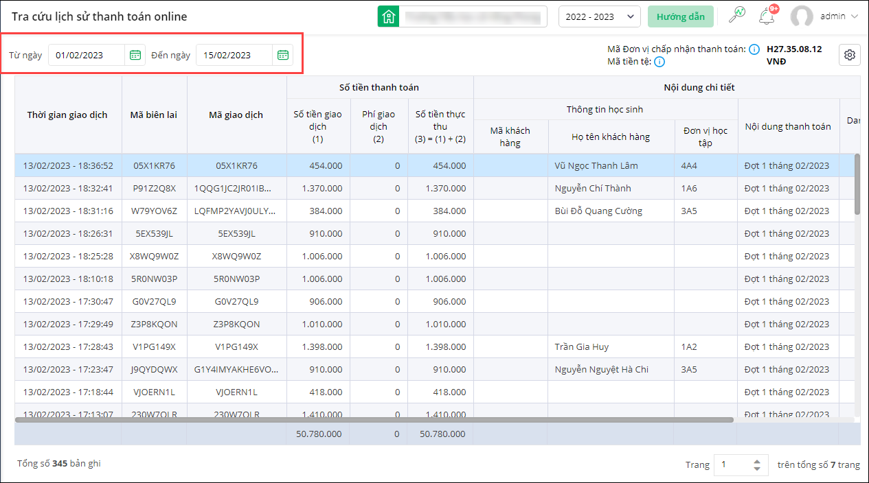 - Tại đây, anh/chị có thể theo dõi lịch sử giao dịch thanh toán online của Phụ huynh. Thiết lập bộ lọc theo thời gian, phần mềm thống kế các giao dịch phát sinh trong khoảng thời gian đã chọn.