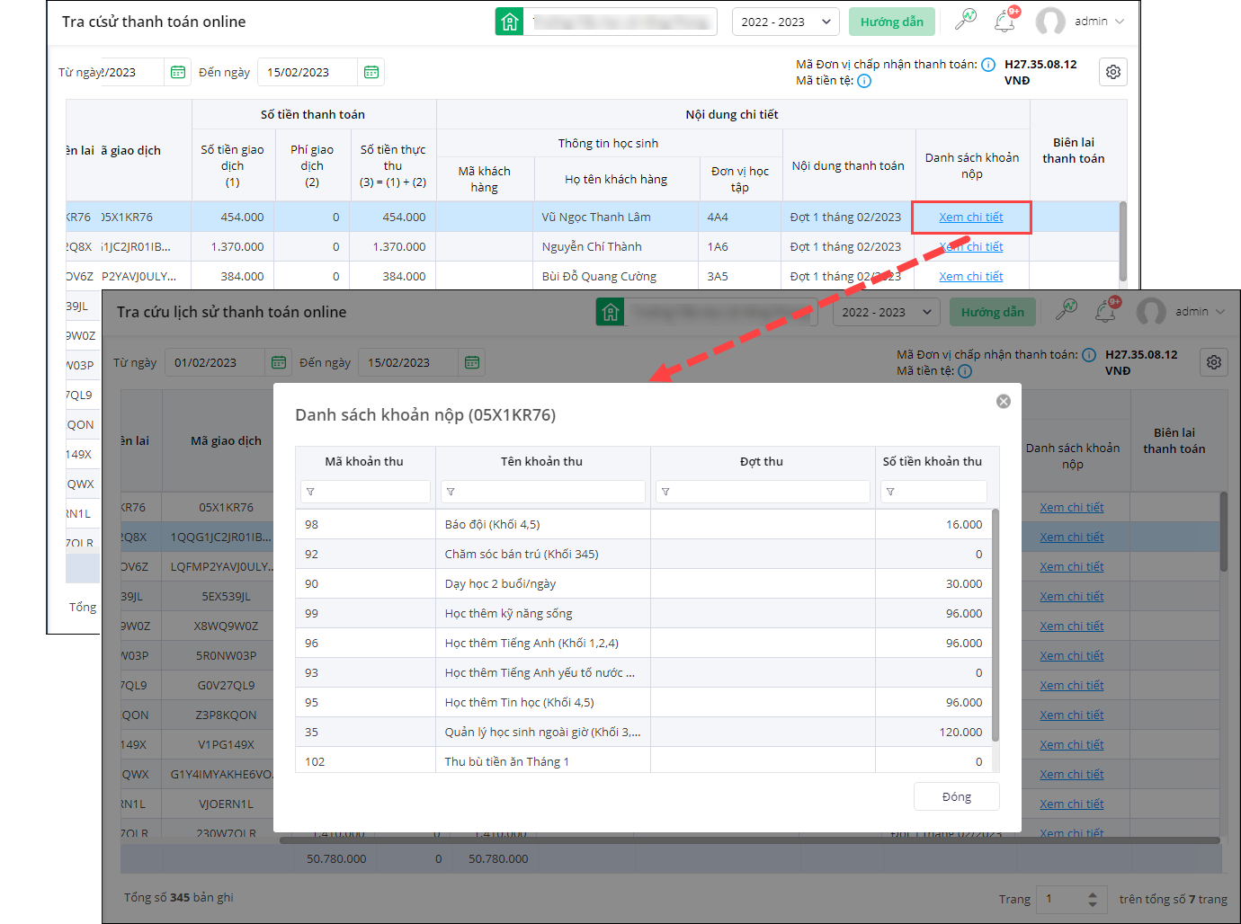 - Anh/chị có thể Xem chi tiết các khoản thu đã nộp.