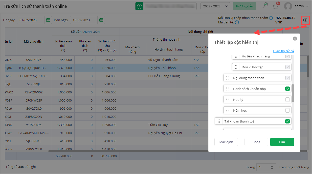 Mục đích: Giúp kế toán nhanh chóng tra cứu các giao dịch thanh toán online để đối soát và đối chứng với phụ huynh khi cần.