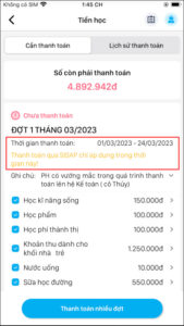 - Tại Học phí, tại danh sách đợt thu cần thanh toán: Hiển thị thông báo cho phụ huynh chỉ được thanh toán online trong thời gian thu dự kiến theo thiết lập nhà trường.