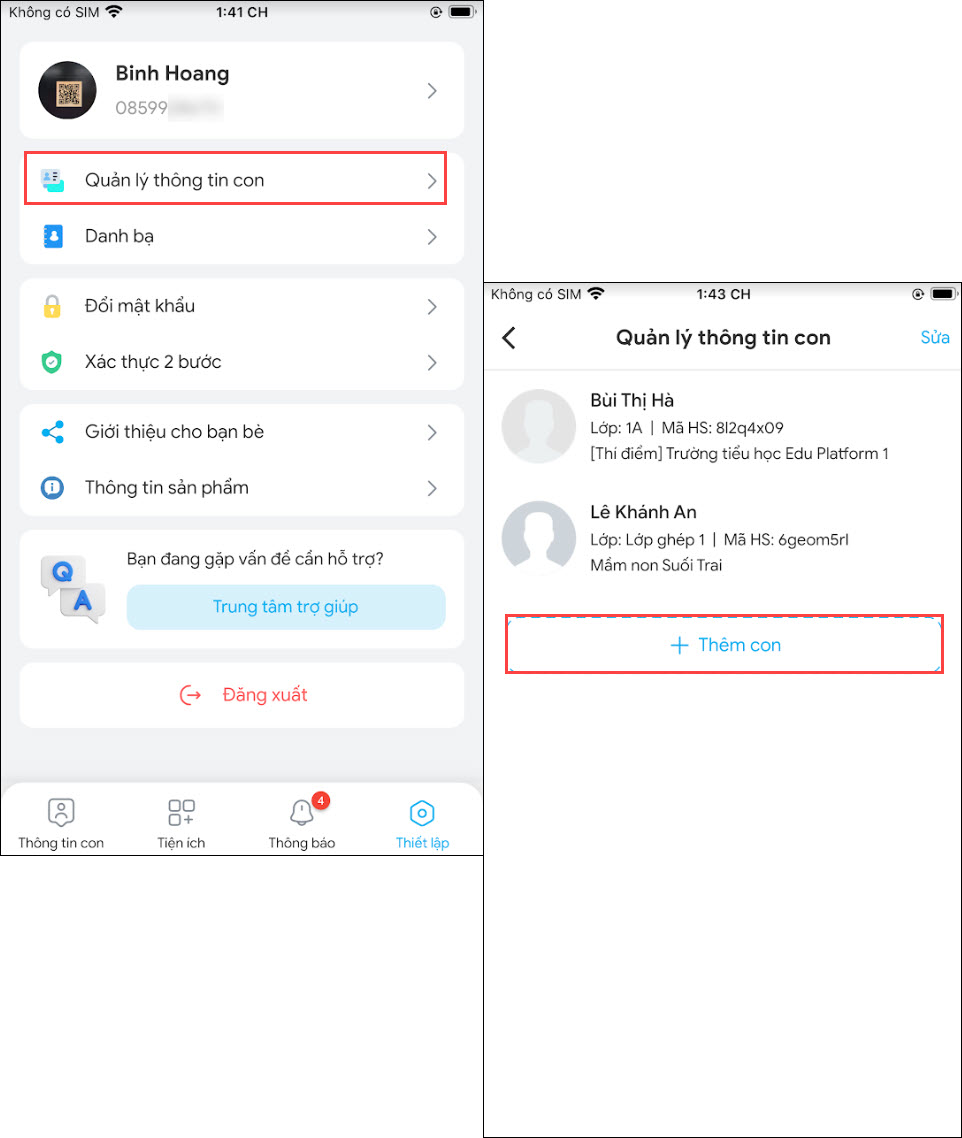 - Phụ huynh dễ dàng nhận biết cách thức quản lý thêm thông tin con.