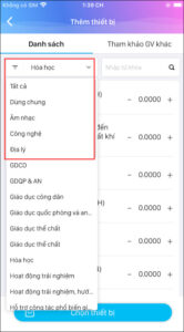 - Khi đăng ký mượn thiết bị, danh sách thiết bị đăng ký mượn trên phần mềm chỉ hiển thị các thiết bị dùng chung hoặc thiết bị theo môn học Giáo viên đang giảng dạy để nhanh chóng tìm kiếm và chọn được thiết bị cần dùng.