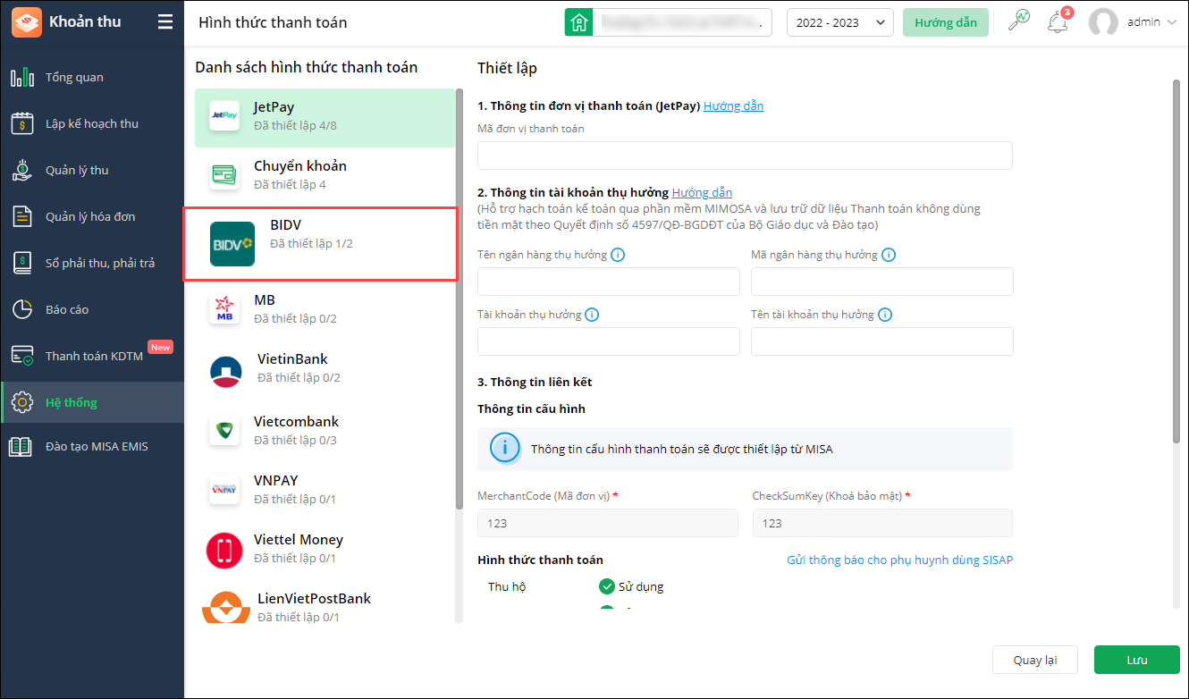 - Tại Hệ thống\Thiết lập\Hình thức thanh toán\Danh sách hình thức thanh toán: Phần mềm vẫn đang hiển thị logo cũ của BIDV, gây khó hiểu và khách hàng thắc mắc khi sử dụng phần mềm.