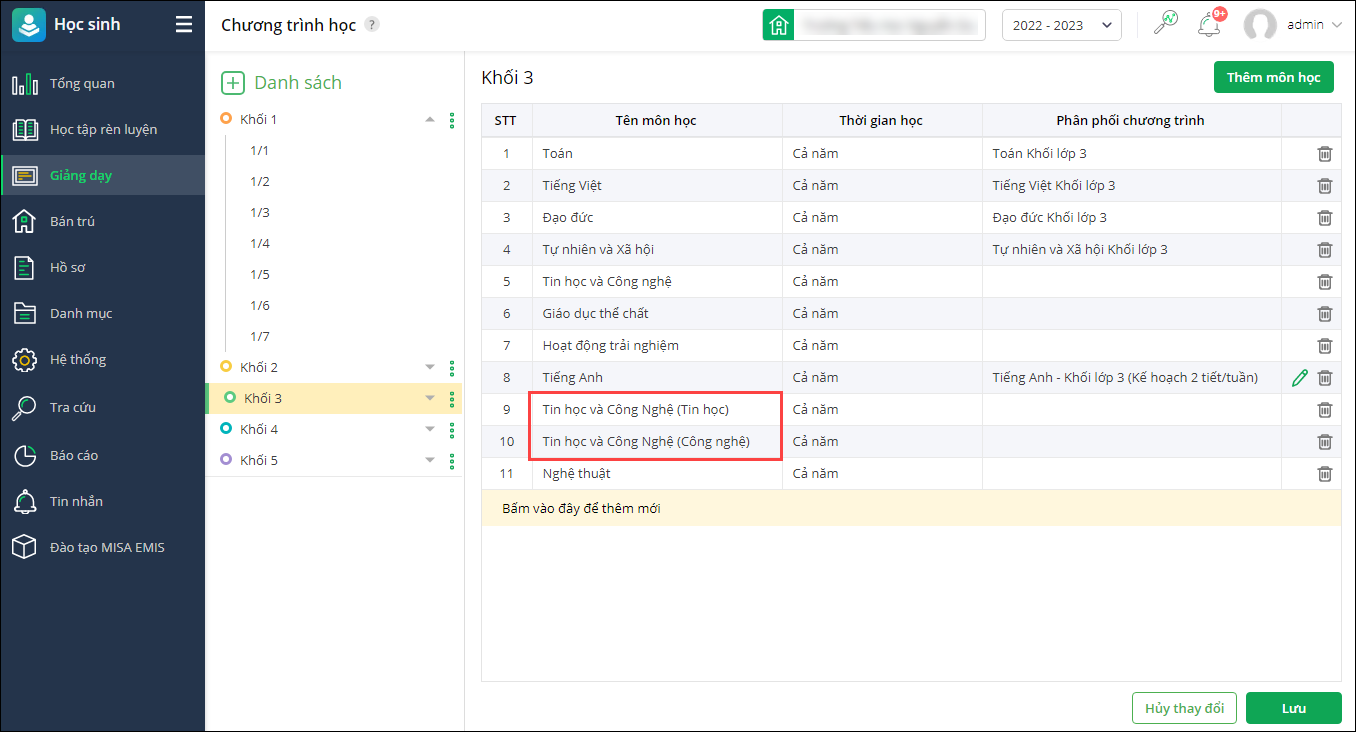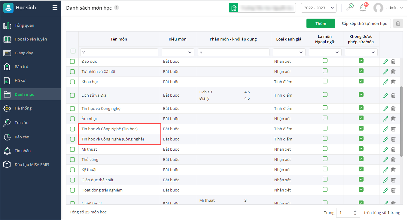 - Bổ sung hai môn mặc định mang đi: Tin học và Công nghệ (Tin học); Tin học và Công nghệ (Công nghệ) tại: