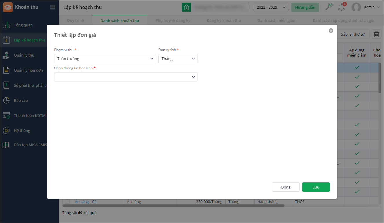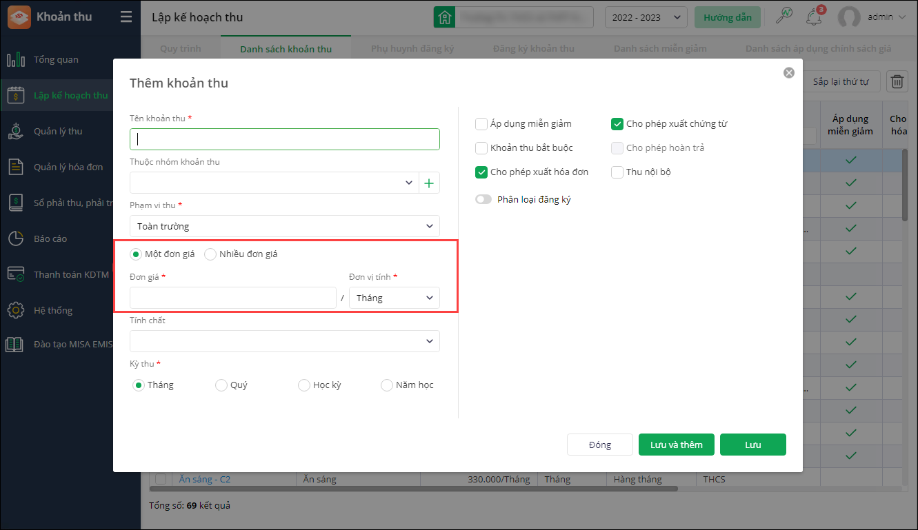 - Tại đơn vị, một khoản thu có nhiều đơn giá khác nhau tùy thuộc vào hệ, khối, lớp, học sinh. Ví dụ: Cùng là khoản thu Học phí hoặc Tiền ăn bán trú.