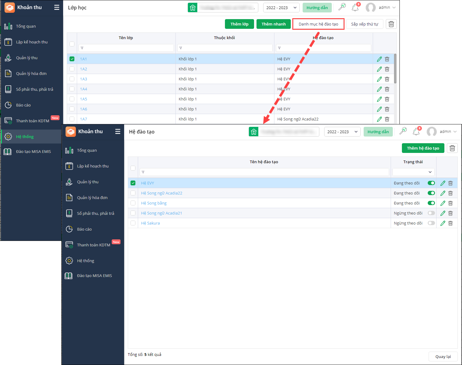 - Danh mục Hệ đào tạo đi xuyên suốt các năm học.
