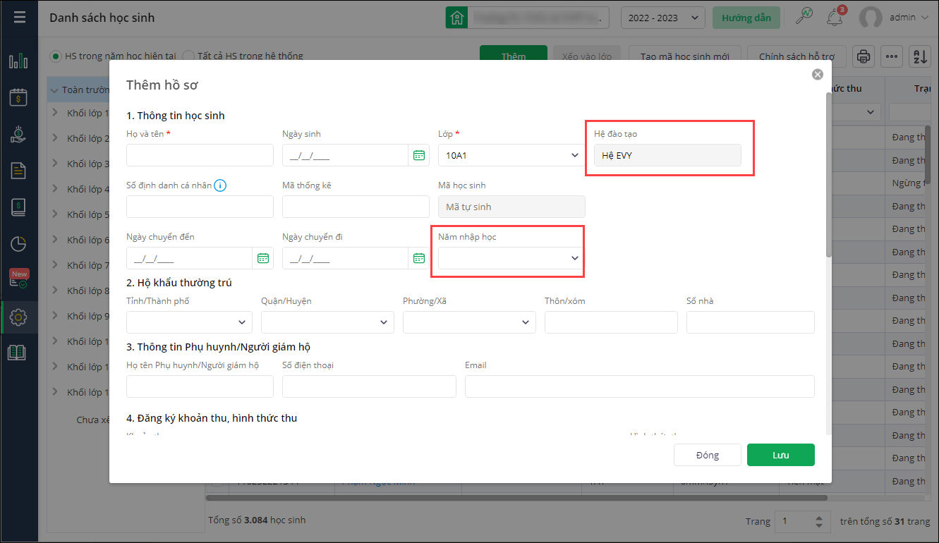- Khi Thêm/Sửa/Nhập khẩu thông tin học sinh: Bổ sung các trường thông tin: Hệ đào tạo; Năm nhập học.