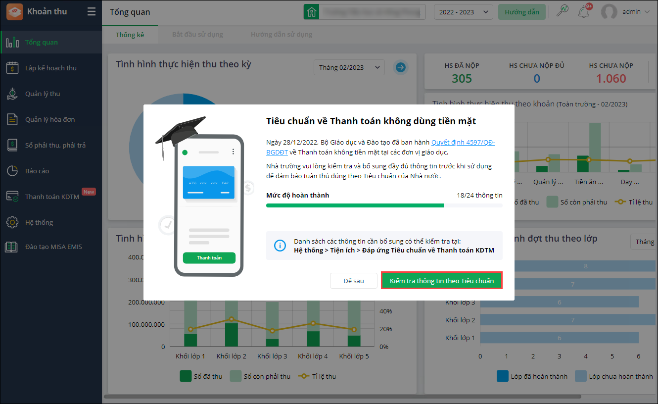 - Sau khi phát hành, hiển thị luồng thông báo giới thiệu Tiêu chuẩn thanh toán không dùng tiền mặt theo Quyết định số 4597/QĐ-BGDĐT.