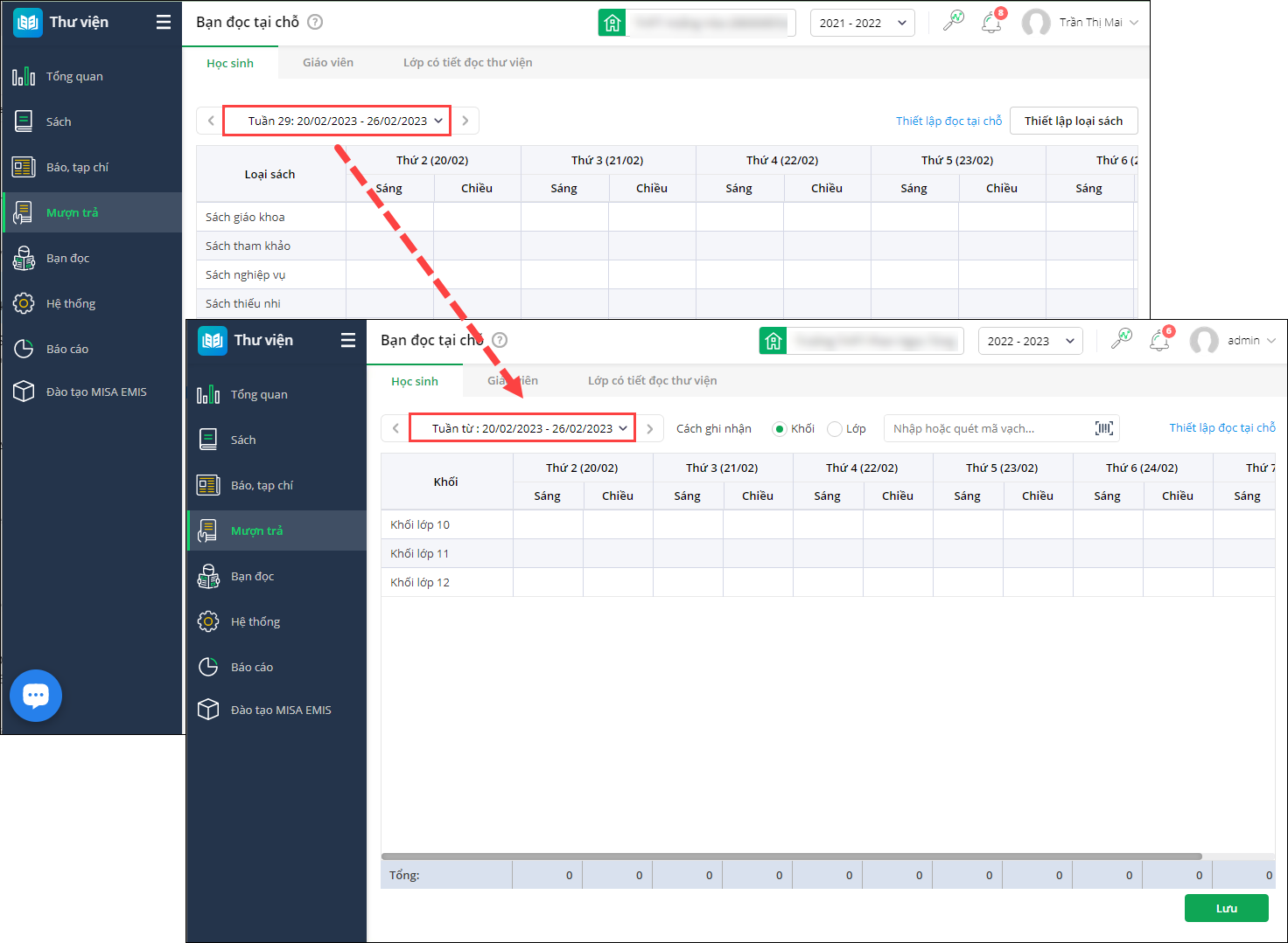 - Tại Mượn trả\Bạn đọc tại chỗ, trên tất cả các mục Học sinh; Giáo viên; Lớp có tiết đọc thư viện: Bỏ Số tuần trên combo thời gian, chỉ hiển thị dạng Tuần từ 20 – 26/02/2023.