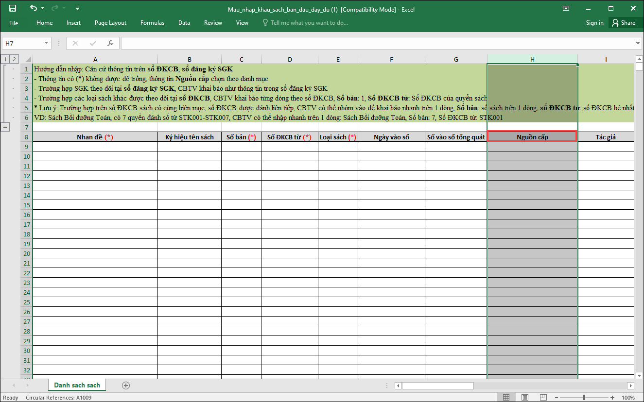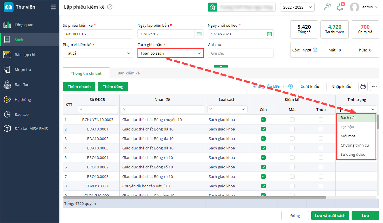 - Nếu Cách ghi nhận là Toàn bộ sách: Cột Tình trạng bao gồm các giá trị: