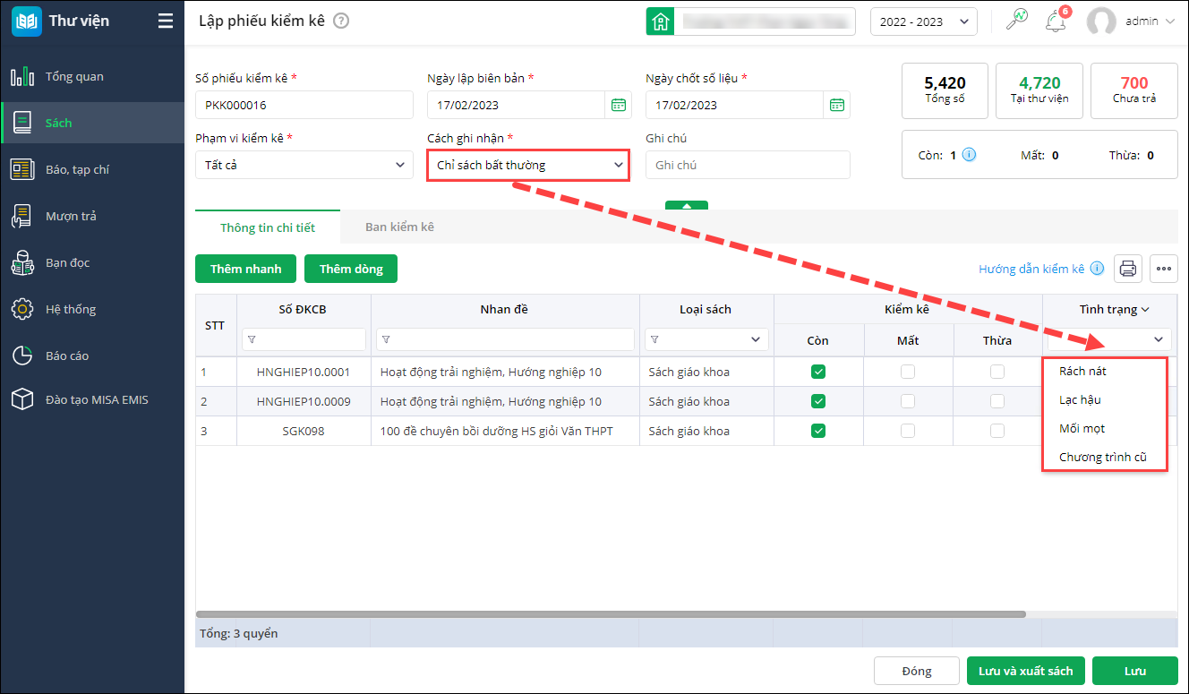 - Sau kiểm kê, nếu CBTV phát hiện sách in hỏng, lỗi, mối mọt thì CBTV ghi nhận đúng tình trạng này trên phiếu kiểm kê.
