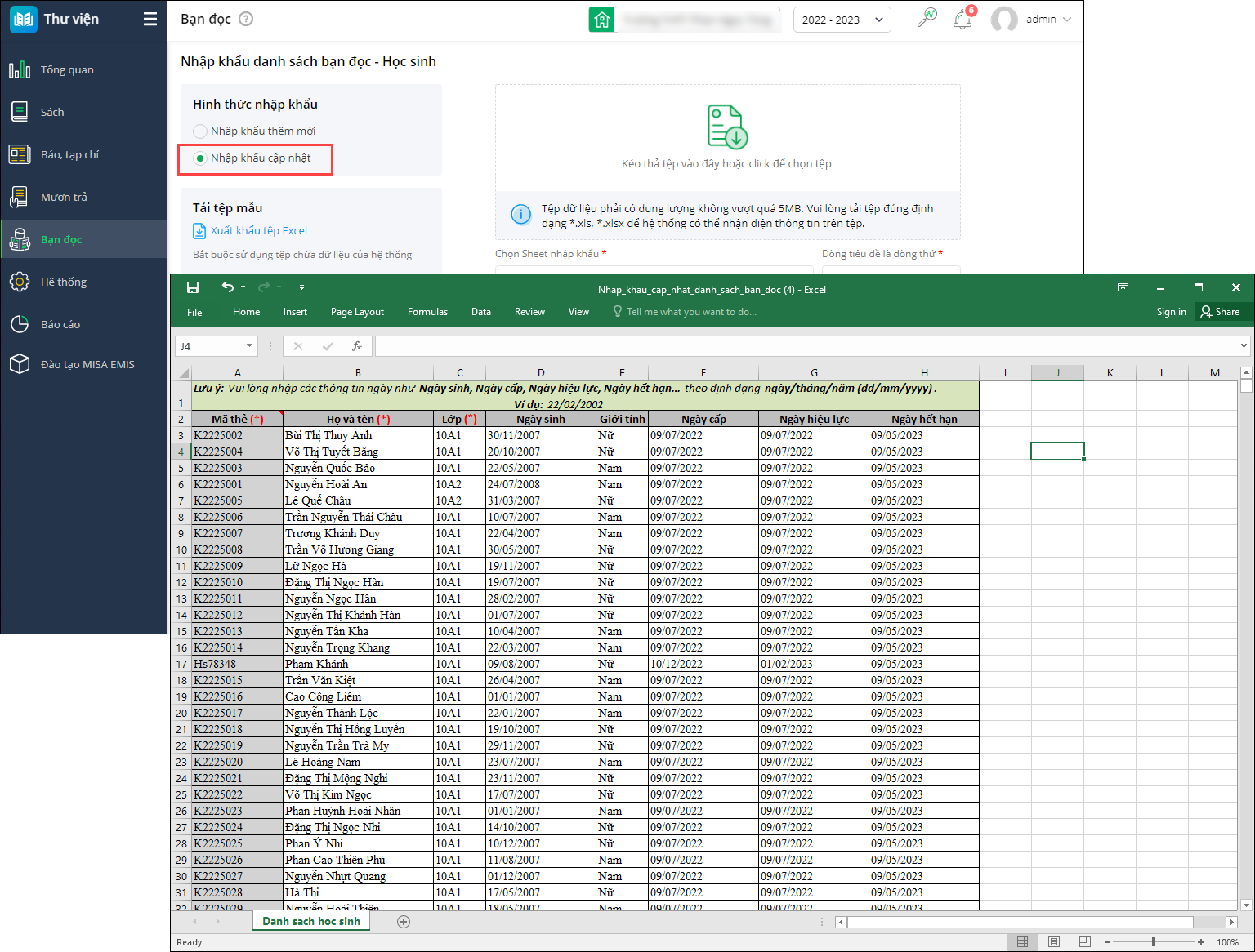 - Tại Bạn đọc\Nhập khẩu, với tệp Nhập khẩu cập nhật: