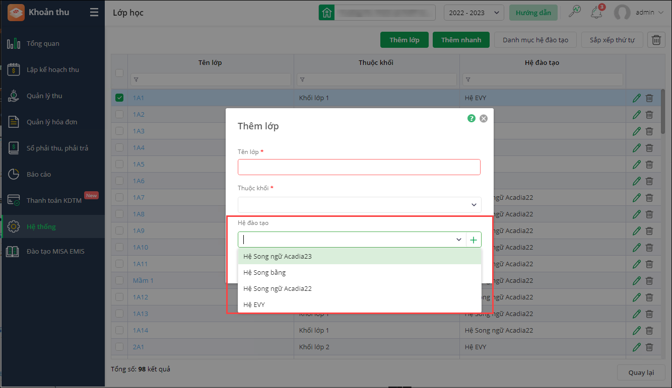 - Có thể chọn trong danh mục trong danh mục hoặc thêm mới hệ đào tạo.