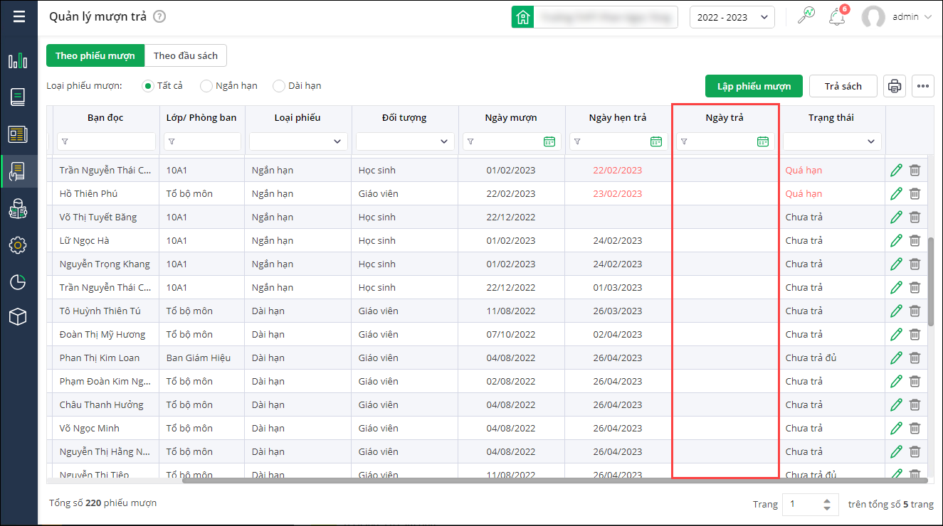 - Nếu đã trả đủ nhưng trả trong nhiều lần thì hiển thị ngày trả là ngày cuối cùng trả sách.