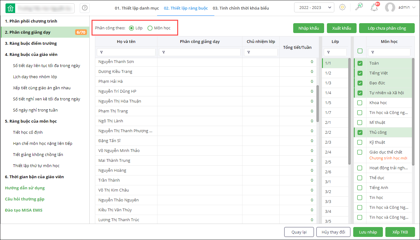 - Tại Thiết lập ràng buộc\Phân công giảng dạy: Với cả mục Phân công theo Môn học và Lớp: