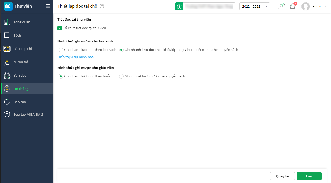 - Tại Tiết đọc tại thư viện, để tổ chức tiết đọc tại thư viện cho các lớp vào thời gian cụ thể, tích chọn Tổ chức tiết đọc tại thư viện.