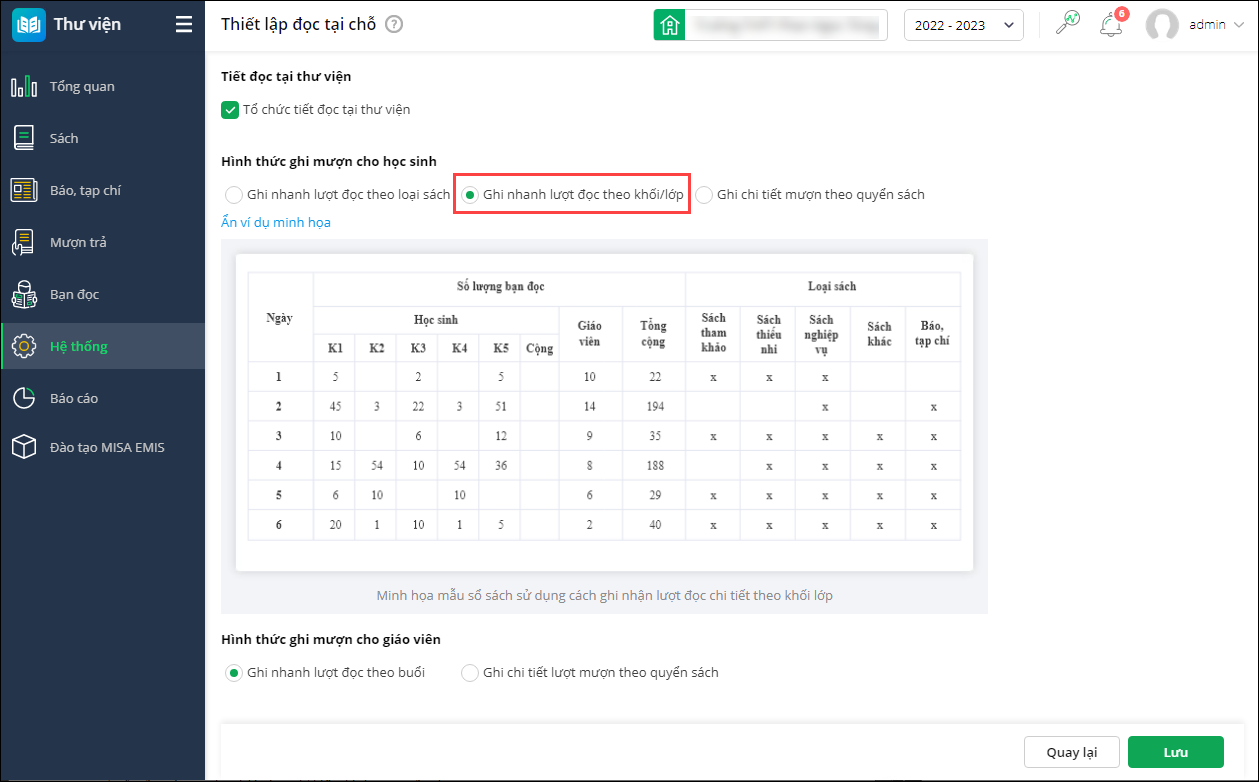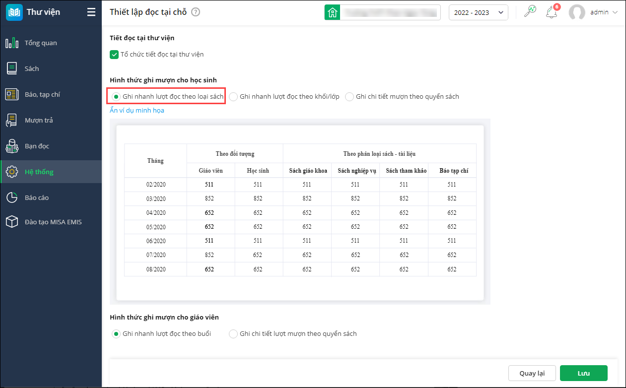 - Nếu chọn Ghi nhanh lượt đọc theo buổi: thống kê theo lượt đọc tại chỗ của bạn đọc giáo viên.