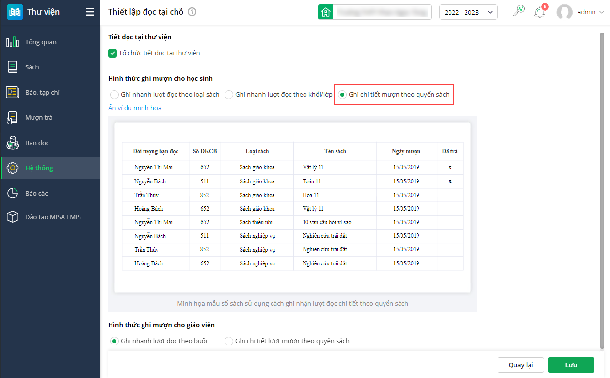 - Tại Hình thức ghi mượn cho học sinh: (Nhấn Hiển thị ví dụ minh họa để xem ví dụ theo từng tùy chọn)