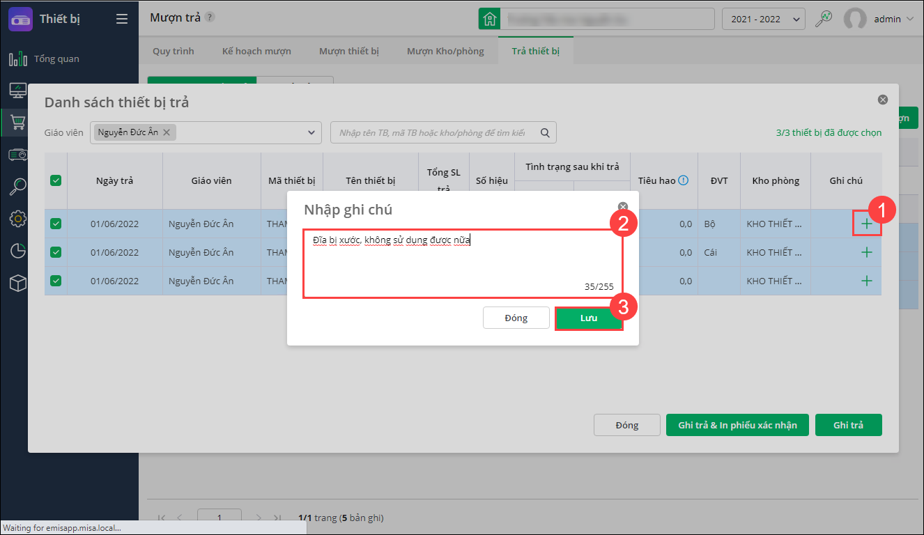 - Ghi trả\Danh sách thiết bị trả: Chưa đáp ứng Cán bộ thiết bị ghi chú, mô tả cụ thể tình trạng thiết bị.
