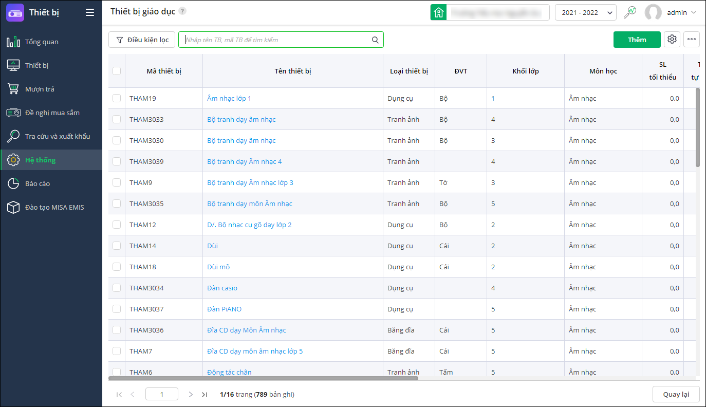 - Tại Hệ thống\Danh mục\Thiết bị giáo dục: Cập nhật danh mục thiết bị tối thiểu.
