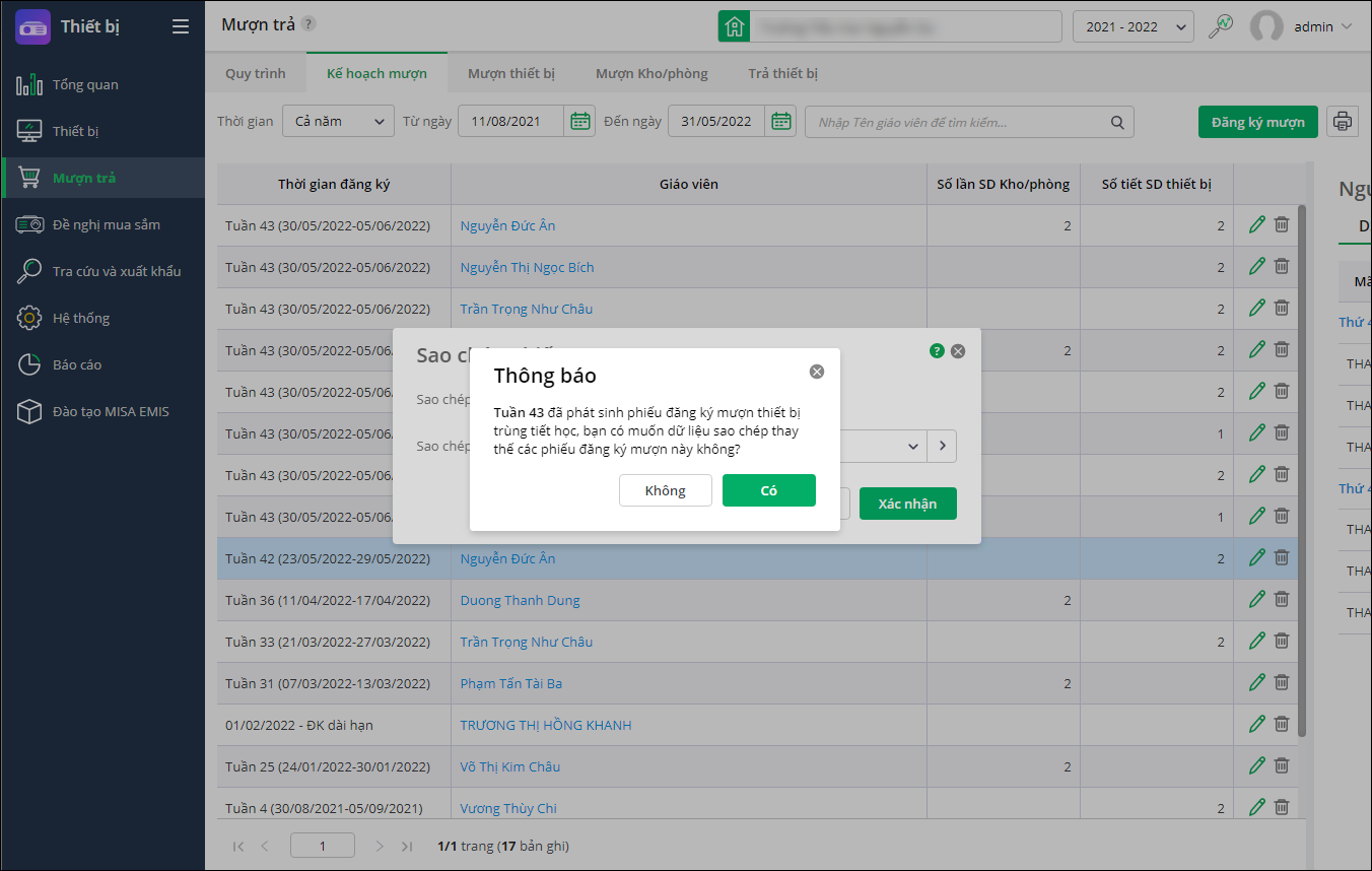 - Trường hợp sao chép sang tuần có phiếu mượn chưa ghi: Tuần <> đã phát sinh phiếu đăng ký mượn thiết bị trùng tiết học, bạn có muốn dữ liệu sao chép thay thế các phiếu đăng ký mượn này không?”