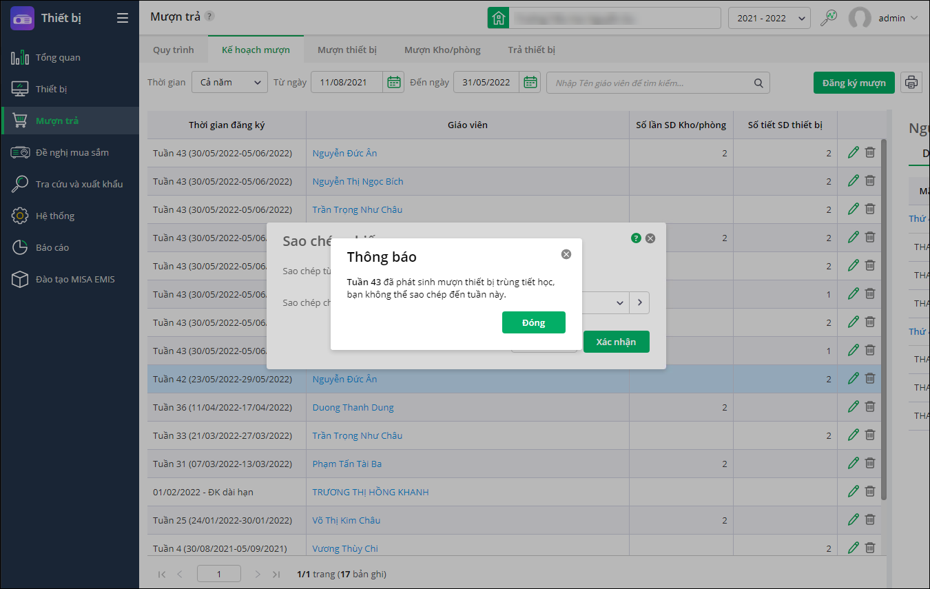 - Trường hợp sao chép sang tuần có phiếu mượn đã được ghi: Tuần <> đã phát sinh mượn thiết bị trùng tiết học, bạn không thể sao chép đến tuần này.”