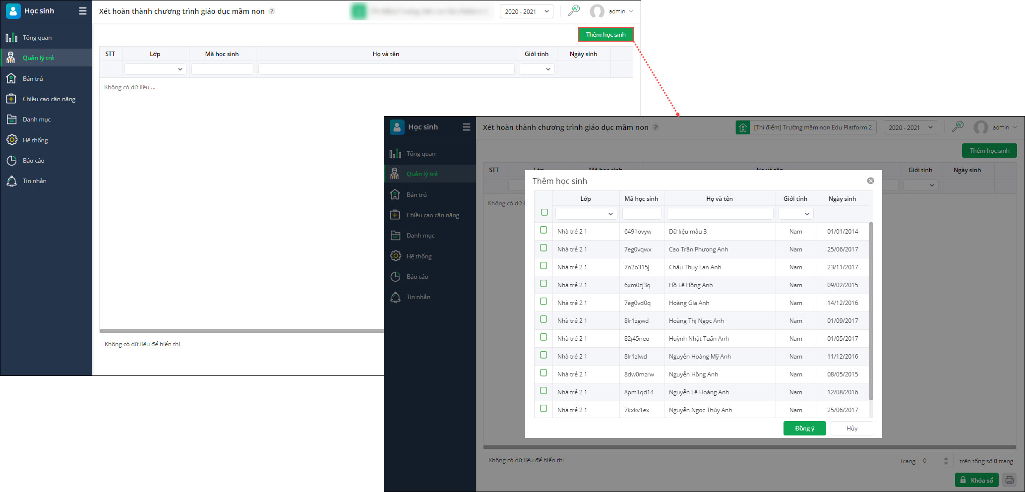 - Nhấn Thêm học sinh nếu muốn bổ sung thêm học sinh vào danh sách xét hoàn thành chương trình giáo dục mầm non: