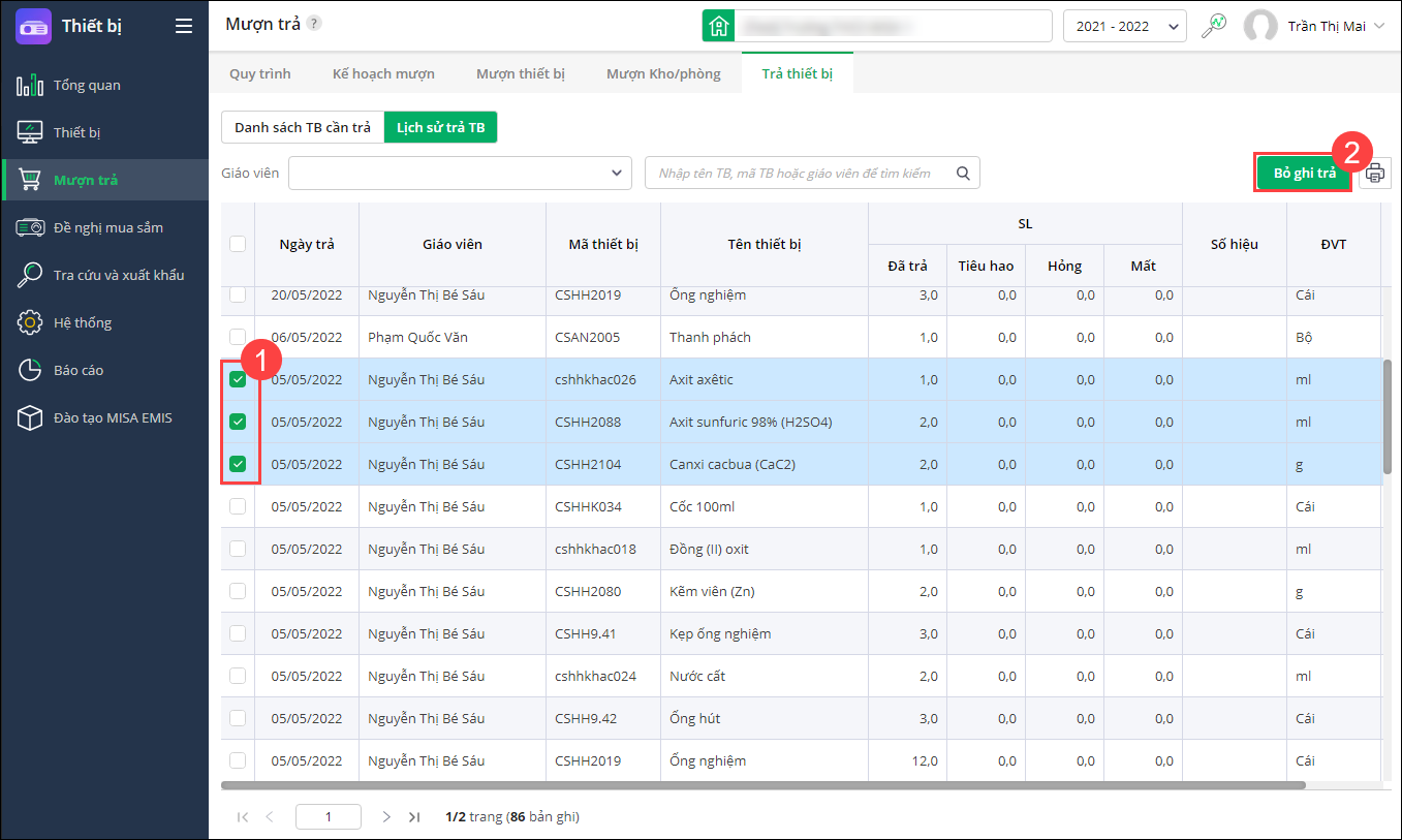 - Tại Mượn trả/Trả thiết bị: