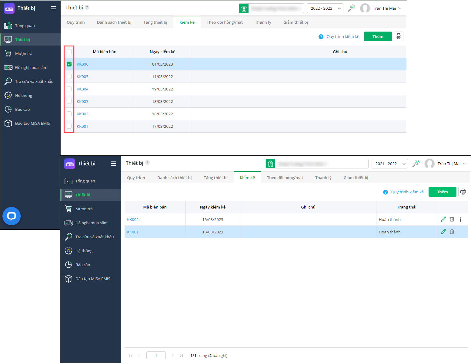 - Tại Thiết bị\Kiểm kê, trên danh sách biên bản kiểm kê: