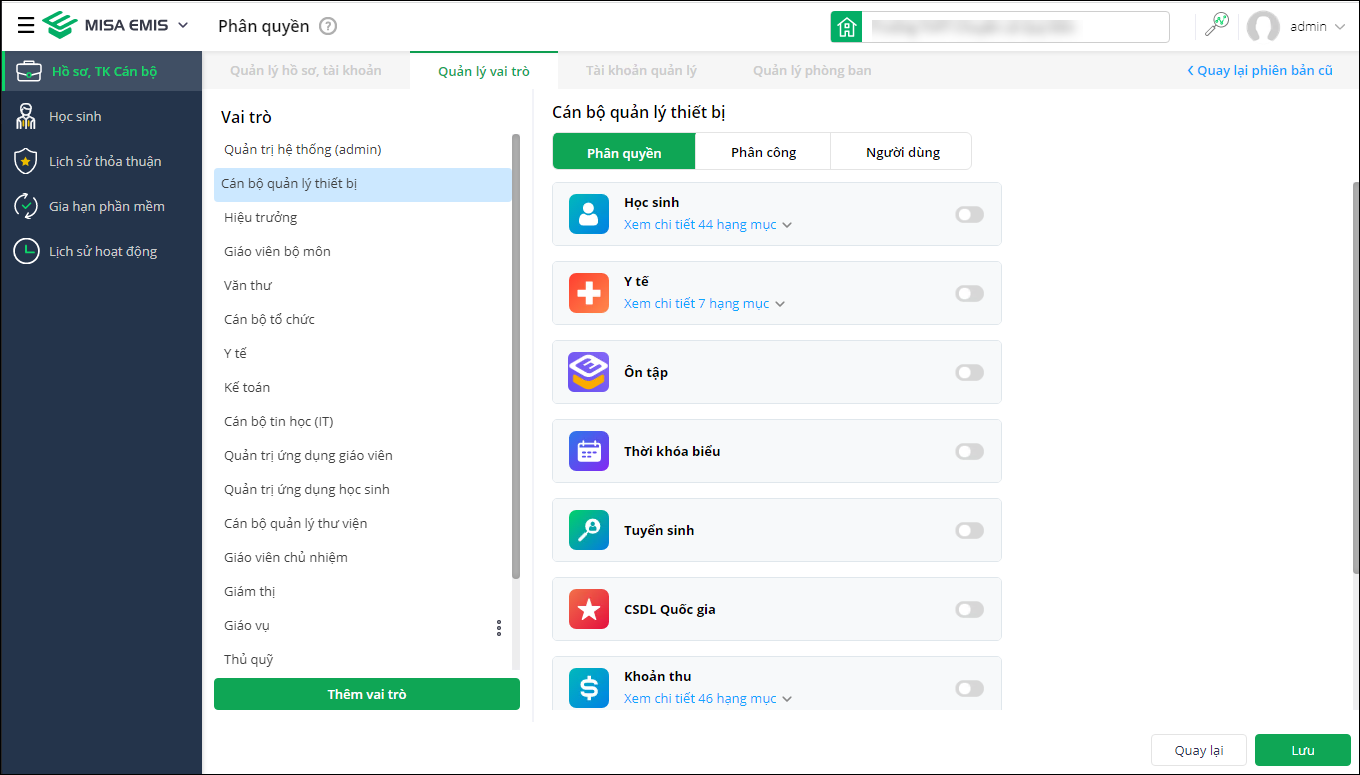 - Tại Tài khoản cán bộ\Quản lý vai trò: Sau khi đã phân quyền và phân công cho cán bộ giáo viên, cán bộ giáo viên chỉ thực hiện được các nghiệp vụ được phân công và phân quyền.