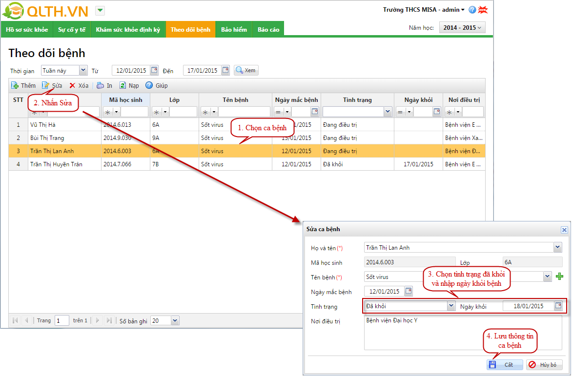 - Khi học sinh khỏi bệnh, Cán bộ y tế cập nhật ngày khỏi bệnh của học sinh