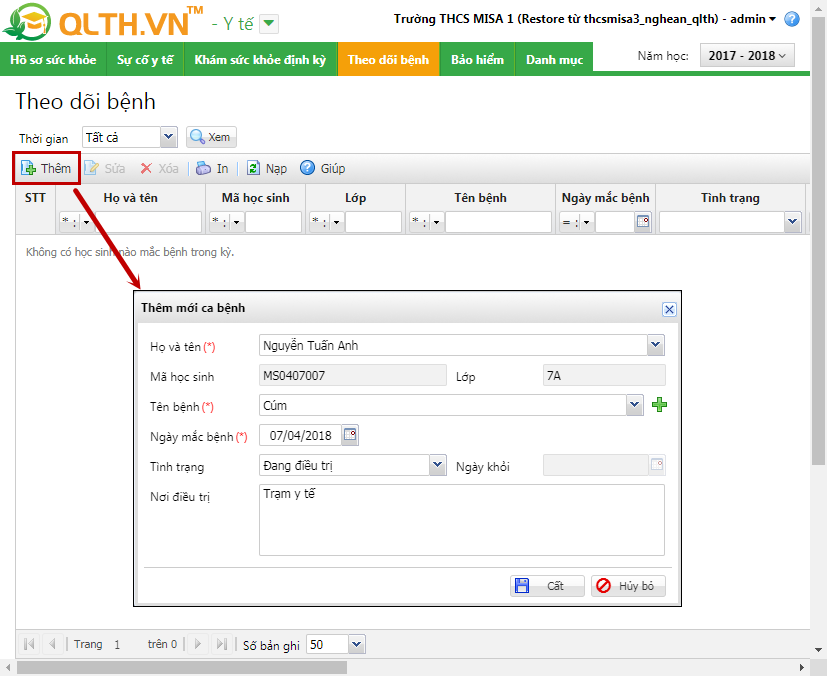 Phần mềm QLTH.VN cho phép cán bộ y tế ghi nhận lại các bệnh phát sinh đối với học sinh mà cần theo dõi và quản lý như Chân tay miệng, Sốt virút,….