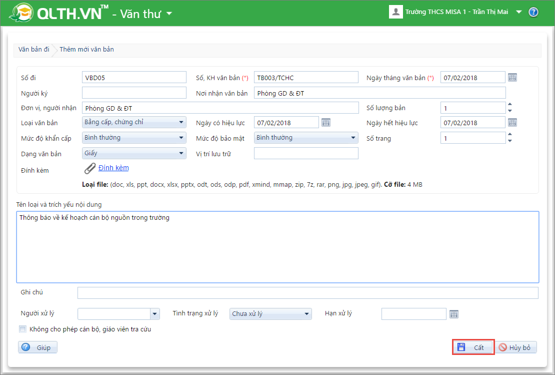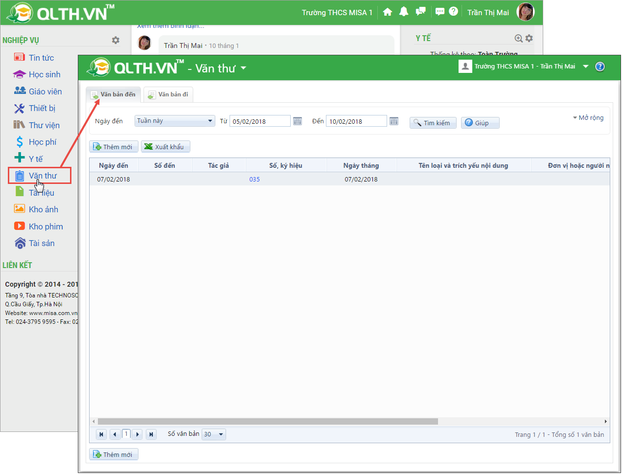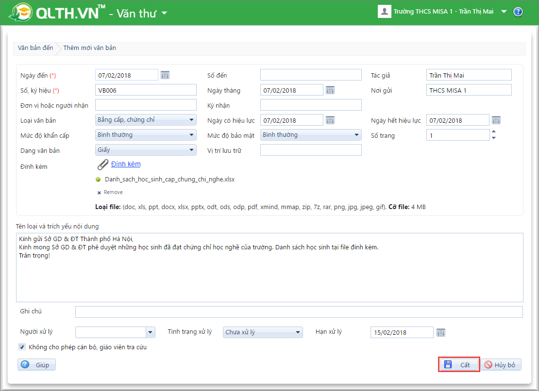 Hỗ trợ Văn thư ghi nhận lại và quản lý các văn bản nội bộ ban hành, các văn bản nhận được từ các cơ quan/tổ chức khác, các văn bản trường học chuyển tới các cơ quan/tổ chức có liên quan khác như Phòng giáo dục, Sở giáo dục, đồng thời có thể xuất khẩu văn bản đến/đi theo đúng thông tư 07/2012/TT-BNV …