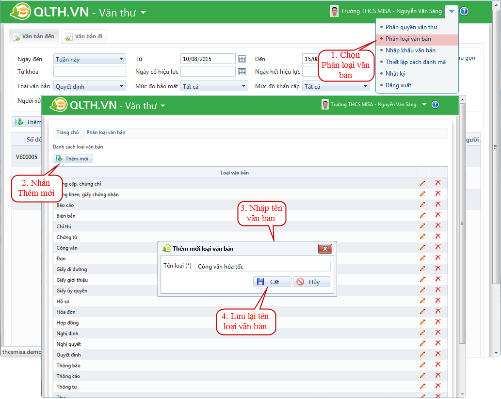 Văn thư thêm mới loại văn bản trên phần mềm
