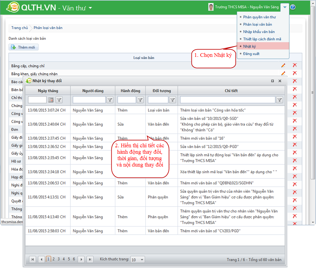 Hệ thống có chức năng tự động lưu lại tất cả các thao tác (thêm, sửa, xóa) của người dùng đối với mỗi một công văn, tài liệu được lưu trữ trên hệ thống quản lý văn thư của phần mềm QLTH.VN, để phục vụ cho công tác truy vấn dấu vết thay đổi khi cần.