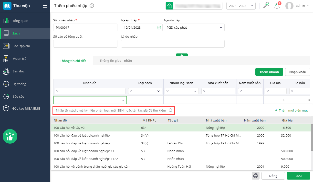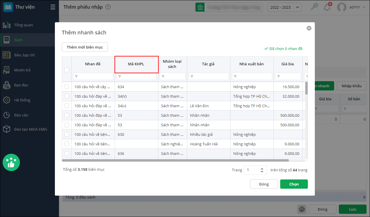 - Tại Sách\Nhập sách\Thêm phiếu nhập\Thêm nhanh: Bổ sung cột Mã KHPL.