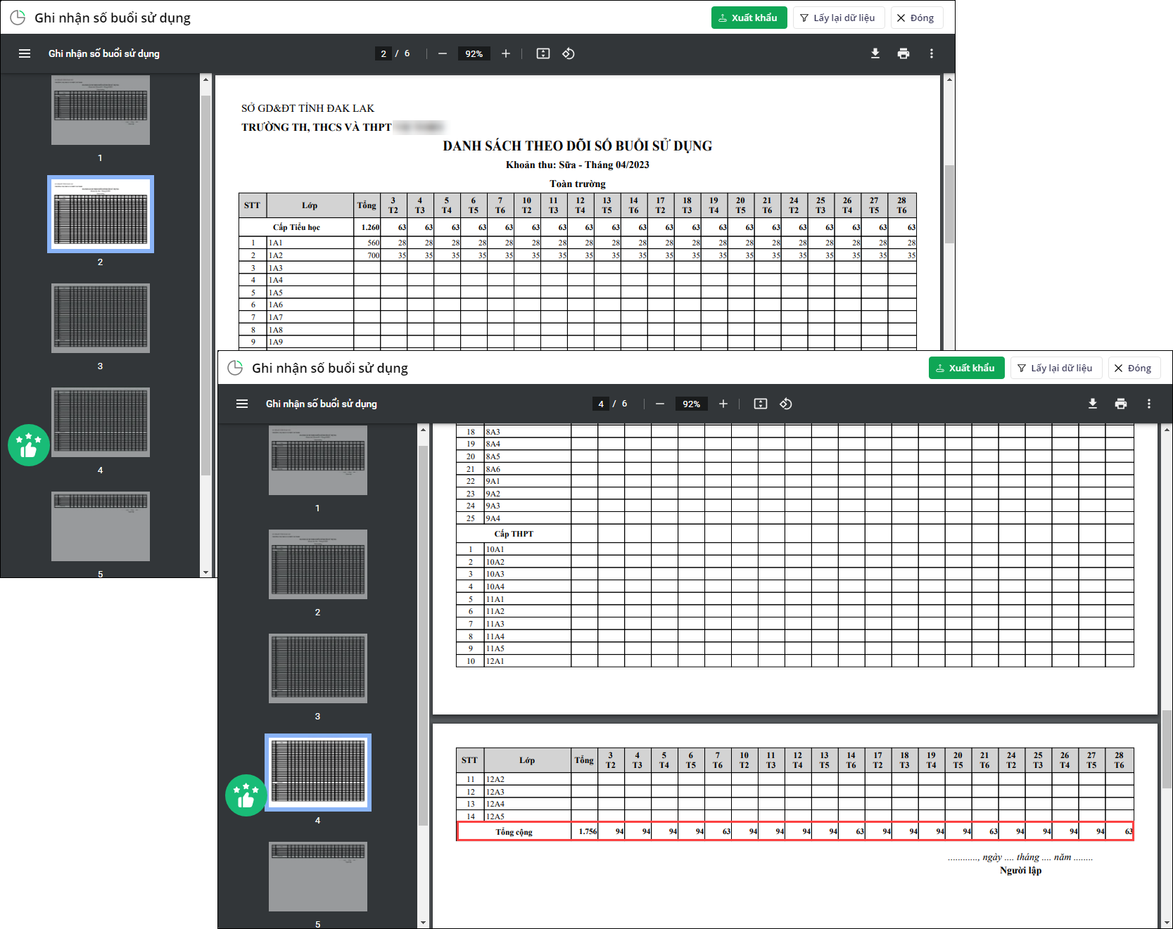3. Tại trường liên cấp, khi in Danh sách theo dõi số lượng sử dụng, Kế toán muốn biết tổng số lượng buổi ăn của toàn trường trong tháng để không mất thời gian tổng hợp thủ công