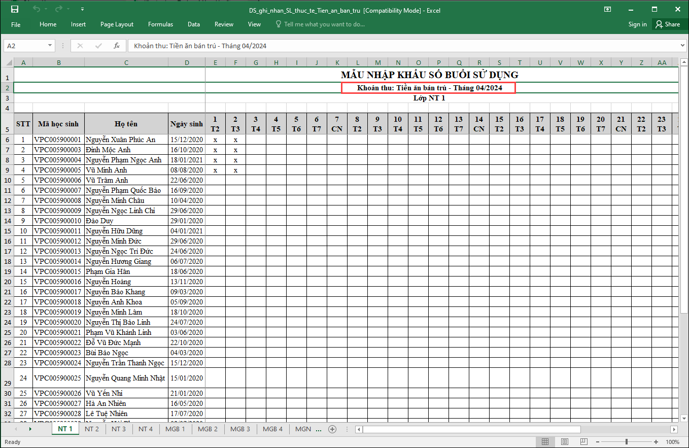 - Nội dung file excel không có tiêu đề nên khi ghi nhận các file của GVCN gửi, Kế toán khó xác nhận đây là danh sách chấm số lượng sử dụng của khoản thu nào, lớp nào để cập nhật vào phần mềm.