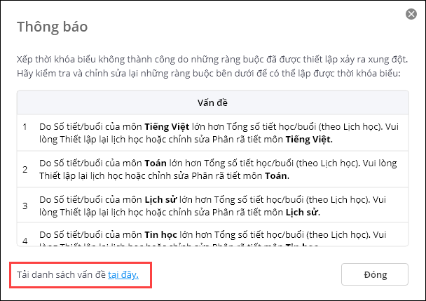 - Khi khai báo các ràng buộc để lập thời khóa biểu, phần mềm hiển thị cảnh báo danh sách các lỗi xung đột.