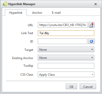 2. Nhập đường dẫn link vào ô URL, nhập từ để hiển thị link vào ô Link Text