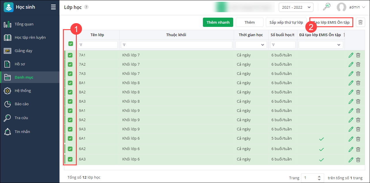 - Tích chọn các lớp cần tạo trên EMIS Ôn tập