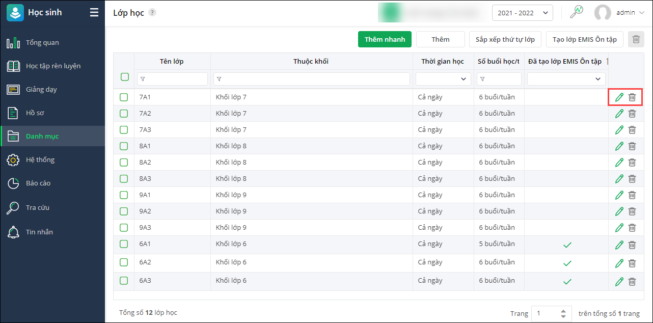 - Lựa chọn lớp học cần thực hiện, nhấn biểu tượng cây bút để sửa hoặc biểu tượng “thùng rác” để xóa.