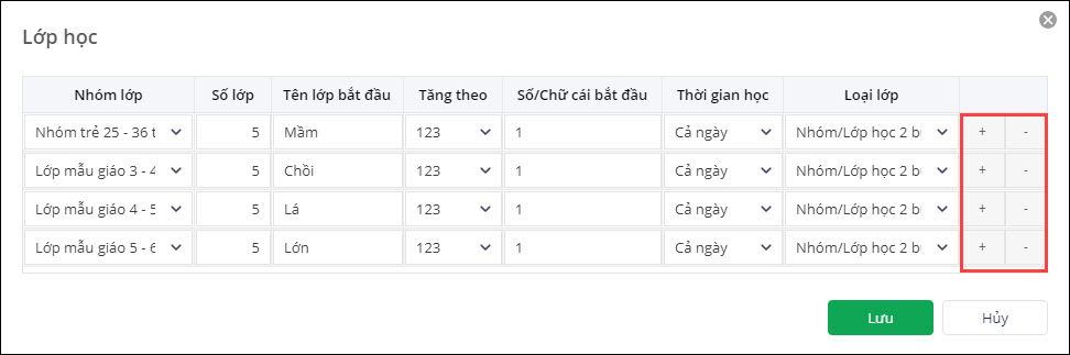Lưu ý: Có thể nhấn biểu tượng “cộng” hoặc “trừ” để thêm giảm lớp học