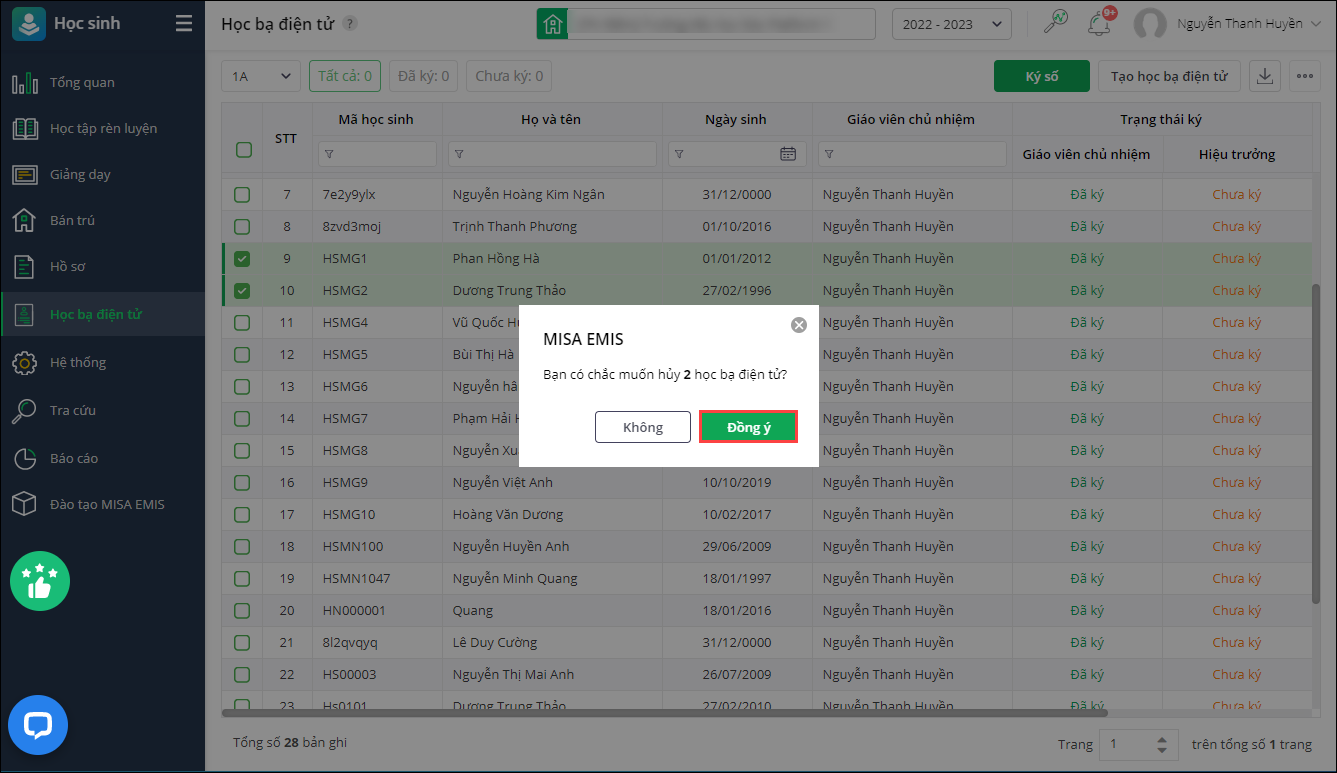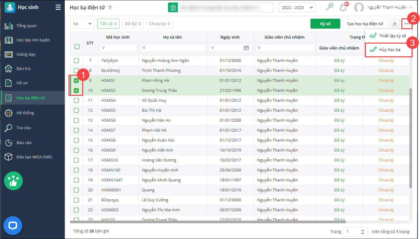 Mục đích: Giúp Giáo viên chủ nhiệm hủy học bạ điện tử đã tạo và đã ký/chưa ký trong trường hợp muốn thay đổi điểm số, thông tin học sinh.