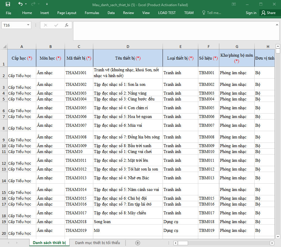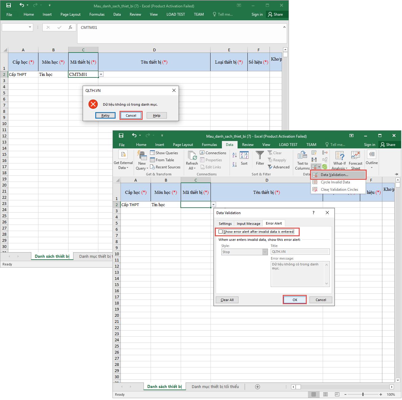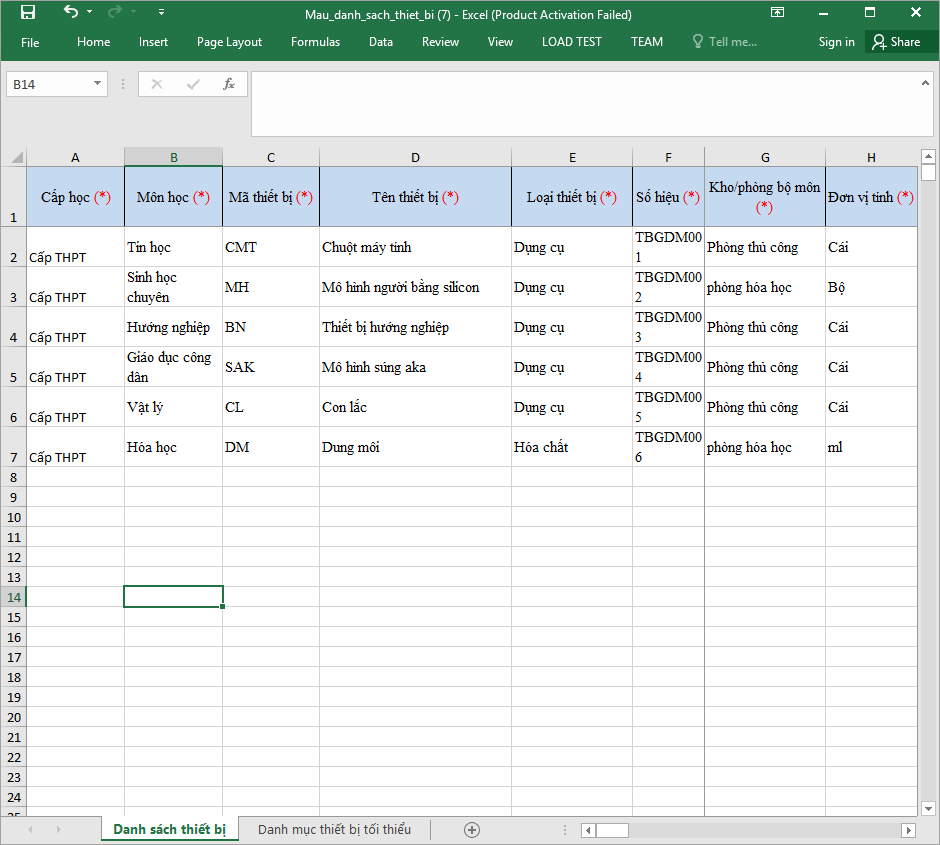 3. Hệ thống lấy lên các thiết bị nằm trong danh mục tối thiểu được quy định, nếu anh/chị sử dụng file này để thêm mới các thiết bị không có sẵn trong danh mục thì khi khai báo Mã thiết bị, file sẽ hiển thị cảnh báo “Dữ liệu không có trong danh mục“. Do đó anh/chị thực hiện như sau: